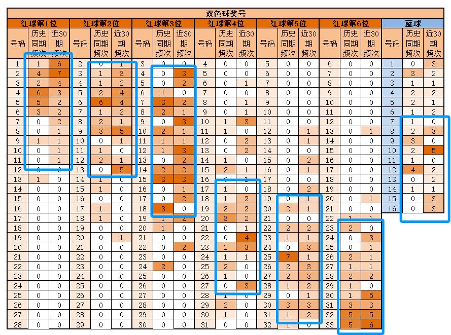 第6位,基本在24-33之间,历史同期频次最多的32-33;近30期,频次最多的为33,明显特征是合数优势;推荐重24-28-30-31-32-33。