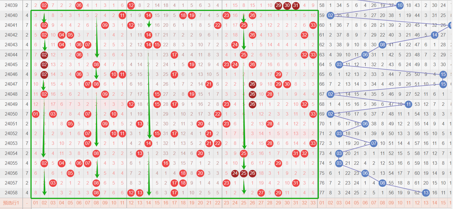 双色球第2024059期组号,去除上期统计排序同位置号码得出: