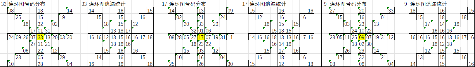 由于数据量大,不一一统计,下图为各个号码分别在33、17、9连环图上的遗漏统计汇总图: