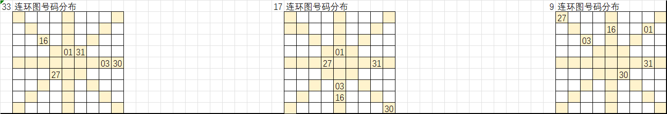以上是遗漏大于16的号码分别在33、17、9连环图的分布,按照九转连环图选号规律,选取这些号码“环上”和“轴上”的相邻号码作为胆码,把这些胆码进行次数统计即可形成我们组号的排序,从出次多到少进行取号得出我们的大底。