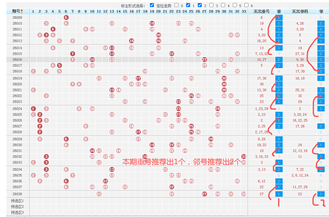 五、综合趋势本期推荐重点关注的号码如下: