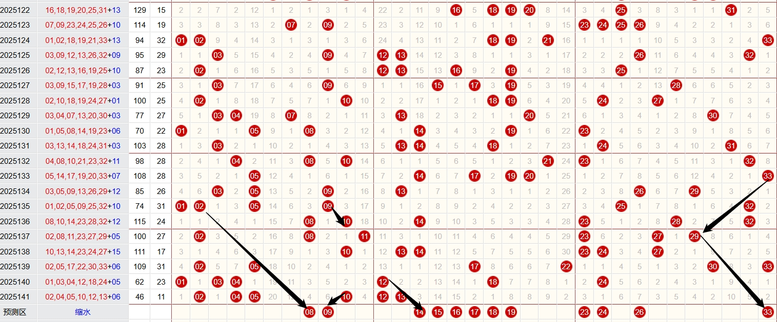 回顾上期25140期开奖02 04 05 10 12 13+ 06  ,其中一小区01-11出4个,二小区12-22出2个号,三小区23-33出0个!