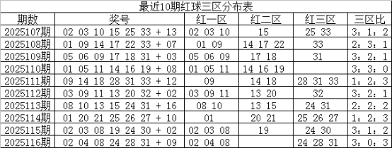 一区上期走热,开出3个红球,近10期开出24个红球,表现非常活跃,本期预计走温,开出1-2个红球,参考号码07;二区上期走冷断区,近10期共开出18个红球,出号比例与理论持平,本期预计继续走温,出现1-2个红球,注意号码17、22;三区上期表现较热,出现3个奖号,近10期共开出18个红球,出号与理论个数持平,本期看好走热,开出3个红球,看好号码25、28、33;