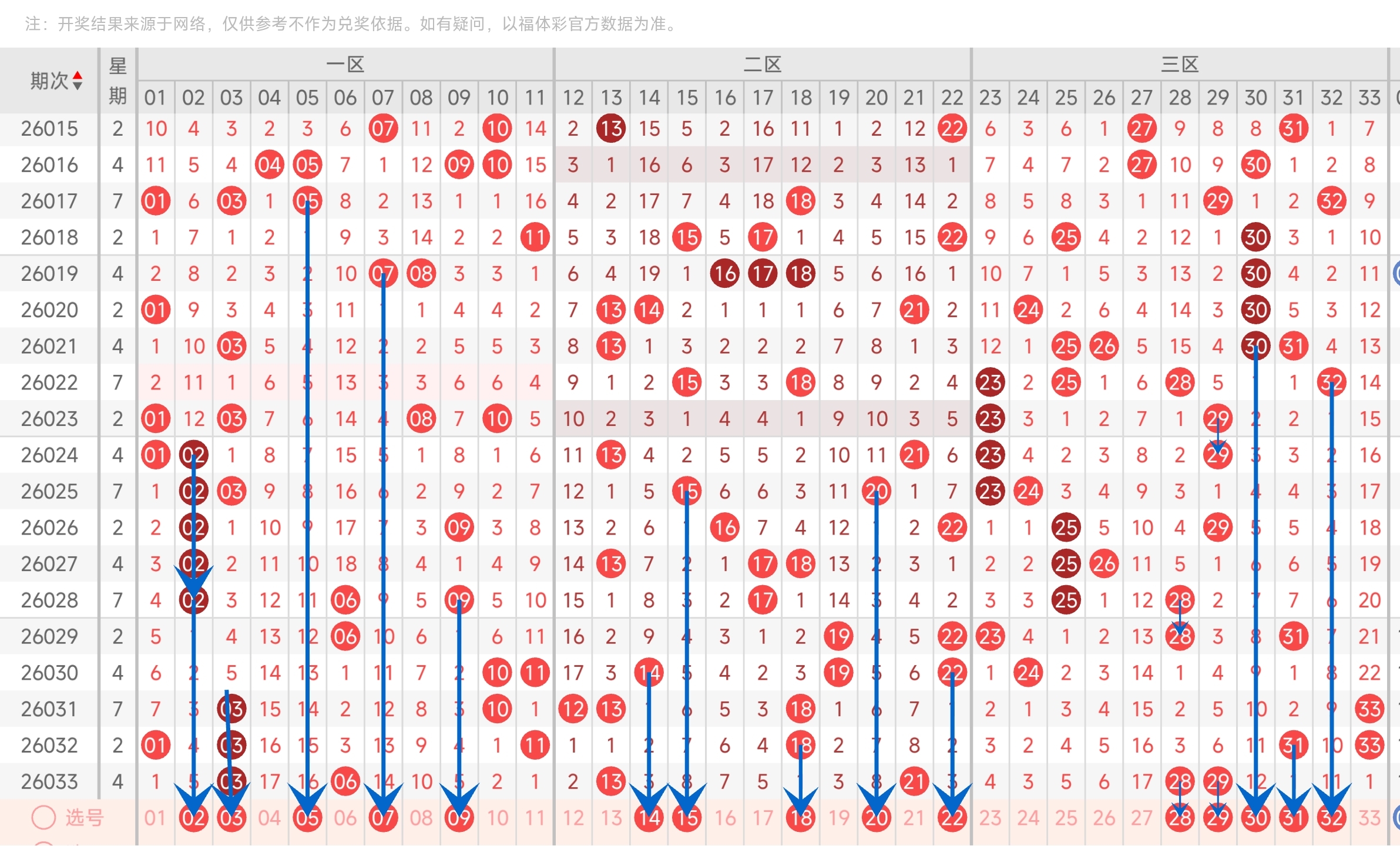 上一期三区开出了28,29号球。往前一期开出了31,33号球。通过走势图分析,可以看到上期三区开了2码,主要集中在中间,再结合前2期号码走势,本期重点关注中间和右边的号码,所以本期要防一下重号。最后再结合冷热号和遗漏期数,本期我们可以关注28,29,30,31,32等号。综上所述本期我们推测有可能开出28,29,30,31,32等号码。