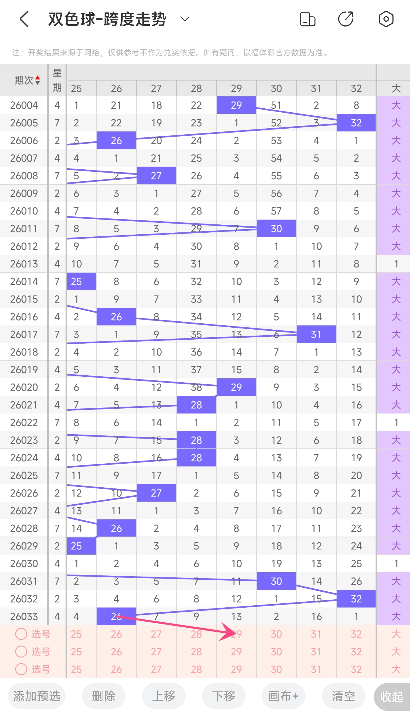 上期龙头为3,凤尾为29,跨度为26,往前一期跨度是32,偏移量为6。26跨度值是30期内开出中间的跨度值。下降的空间和上升空间差不多,再根据最近龙头凤尾走势,本期跨度可能会变大,所以推测本期跨度趋势是往右的,跨度变大,小概率跨度变小。