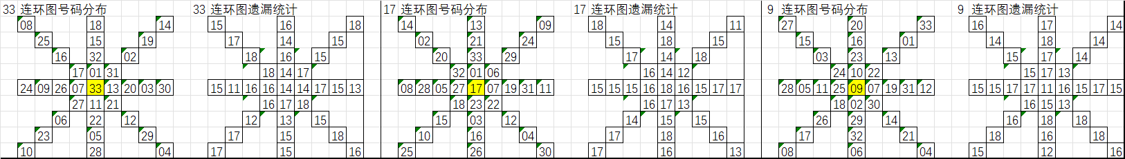 由于数据量大,不一一统计,下图为各个号码分别在33、17、9连环图上的遗漏统计汇总图: