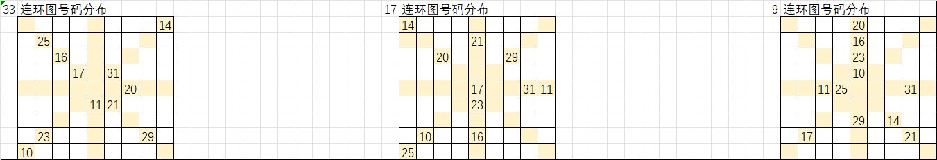 以上是遗漏大于16的号码分别在33、17、9连环图的分布,按照九转连环图选号规律,选取这些号码“环上”和“轴上”的相邻号码作为胆码,把这些胆码进行次数统计即可形成我们组号的排序,从出次多到少进行取号得出我们的大底。