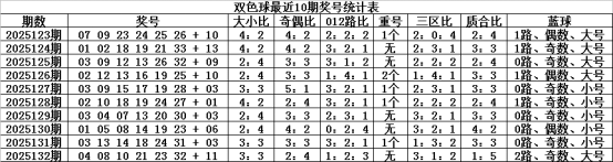 上期奇偶比为2:4,偶数较热,近10期奇偶比为33:27,奇数红球活跃,其中奇数红球热
