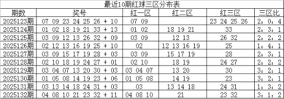 一区上期走热,开出3个红球,近10期开出21个红球,走势与理论相当,本期预计再次走温,出现1-2个奖号,参考号码03、05;二区上期走温,开出1个红球,近10期共开出22个红球,出号比例与理论持平,本期预计继续走温,出现1-2个红球,注意号码22;三区上期走温,开出2个红球,近10期共开出17个红球,走势相对较冷,本期注意回补,关注3个红球,看好号码23、29、33;