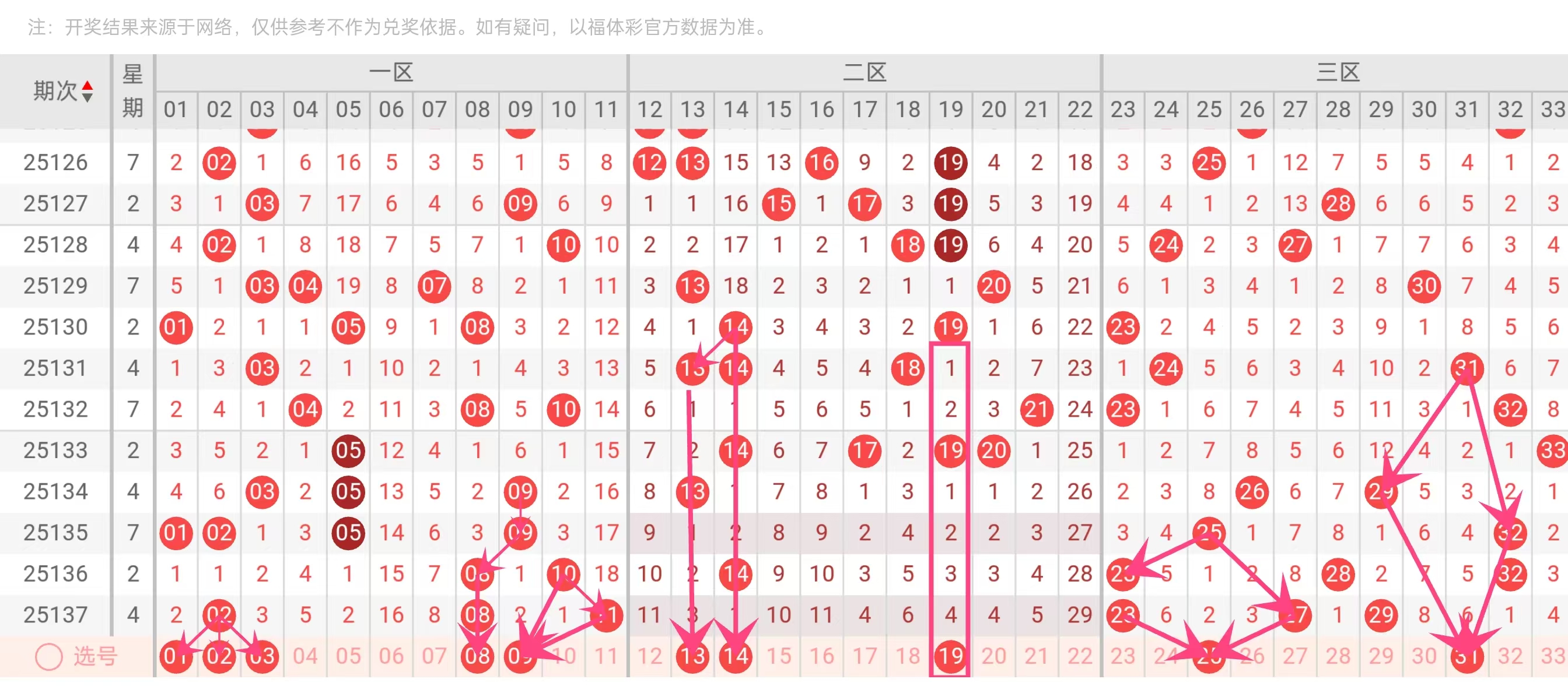 10个红球:01、02、03、08、09、13、14、19、25、31