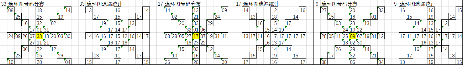 由于数据量大,不一一统计,下图为各个号码分别在33、17、9连环图上的遗漏统计汇总图: