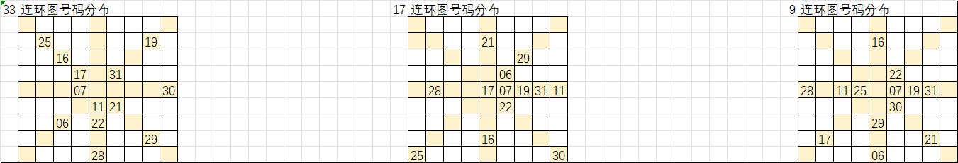 以上是遗漏大于16的号码分别在33、17、9连环图的分布,按照九转连环图选号规律,选取这些号码“环上”和“轴上”的相邻号码作为胆码,把这些胆码进行次数统计即可形成我们组号的排序,从出次多到少进行取号得出我们的大底。