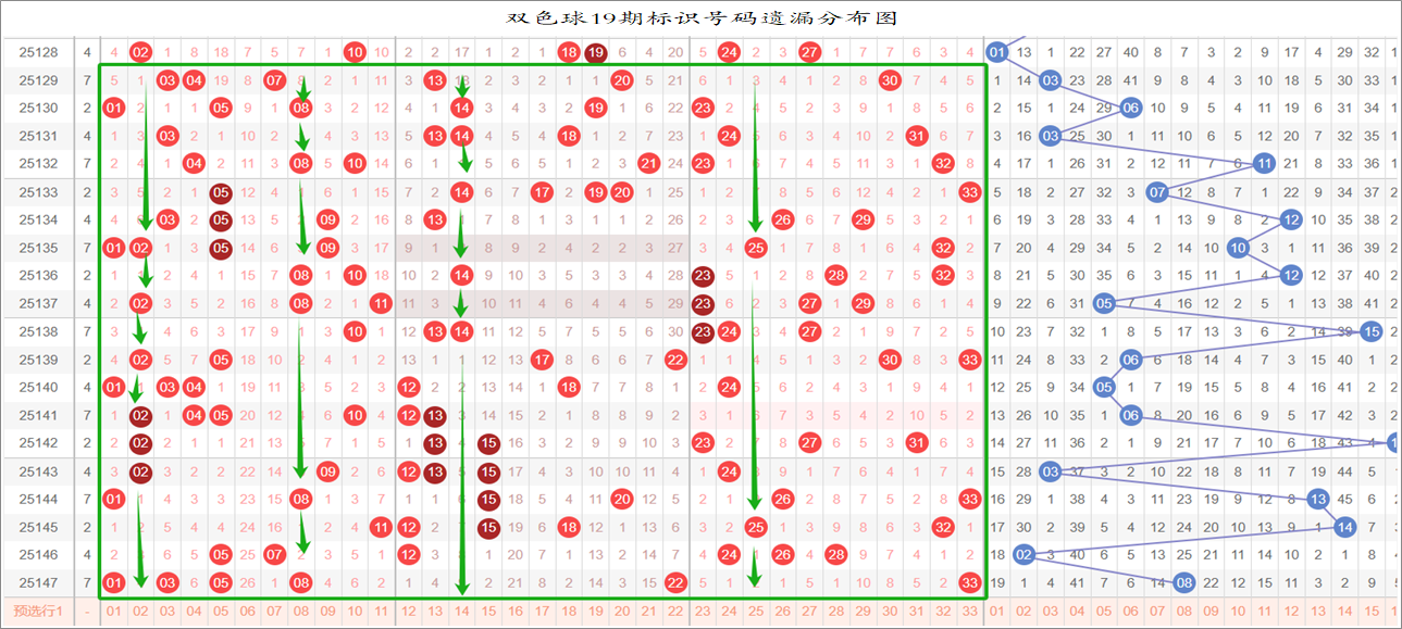 以上是33、17、9的连环图,可以在一起彩平台的九转连环图中查看历期号码分布,以当前期数来看,我们以19期号码来进行遗漏统计,然后把每个号码在近19期的遗漏总数统计出来,分别带入33、17、9的连环图,取出遗漏值大于16的号码,把这些号码在“环上”和“轴上”的相邻号码取出来进行统计,选取出次前15的号码作为大底。