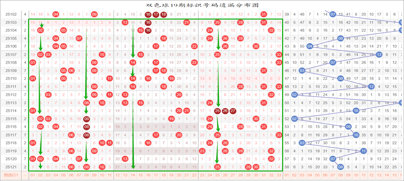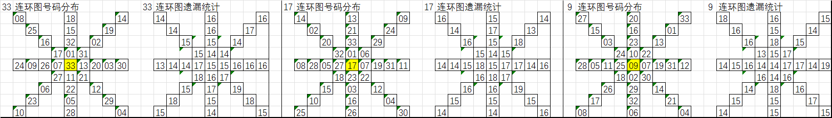 由于数据量大,不一一统计,下图为各个号码分别在33、17、9连环图上的遗漏统计汇总图: