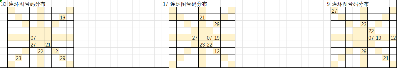 我的思路主要是统计分析九转连环图,彩虹官方平台上也有分布图,我们先来看看原理。九转连环图是宋代数学家杨辉的“幻圆”演变而来的,每个圆环、每条轴(不含中心数字)的和值均相等。经过各位前辈老师不断改进应用,形成了以中心数字为33、17、9的连环图,保持每个圆环、每条轴等和值的特点,这里要感恩古代文化的博太精深,也要感谢各位前辈推演应用的方法。