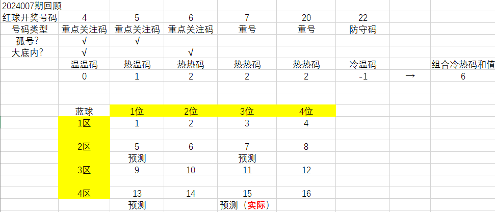 因2024007期蓝球号码为15,属于4区3位,与上期的5相比区差值为2,位差值为2,在差值频数中区差值为第二,位差值为二