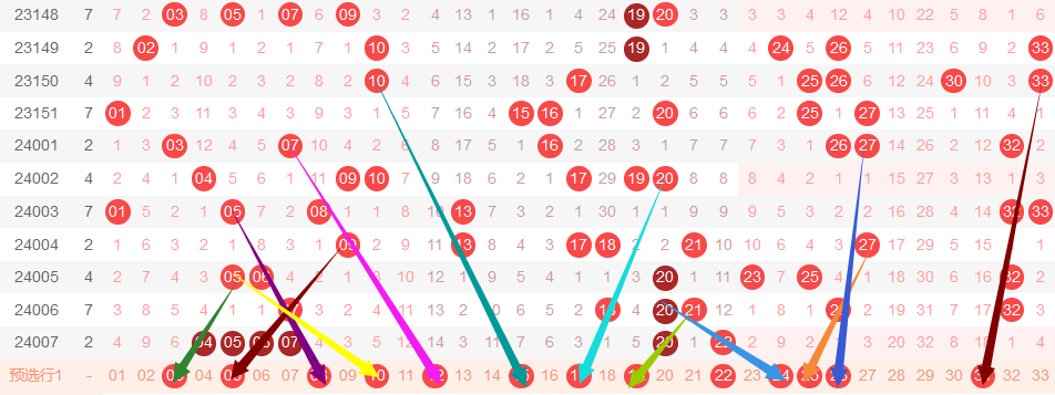 重点关注码:与本期间隔为1~4期的号码:1、8、9、13、17、18、21、23、25、26、27、32、33