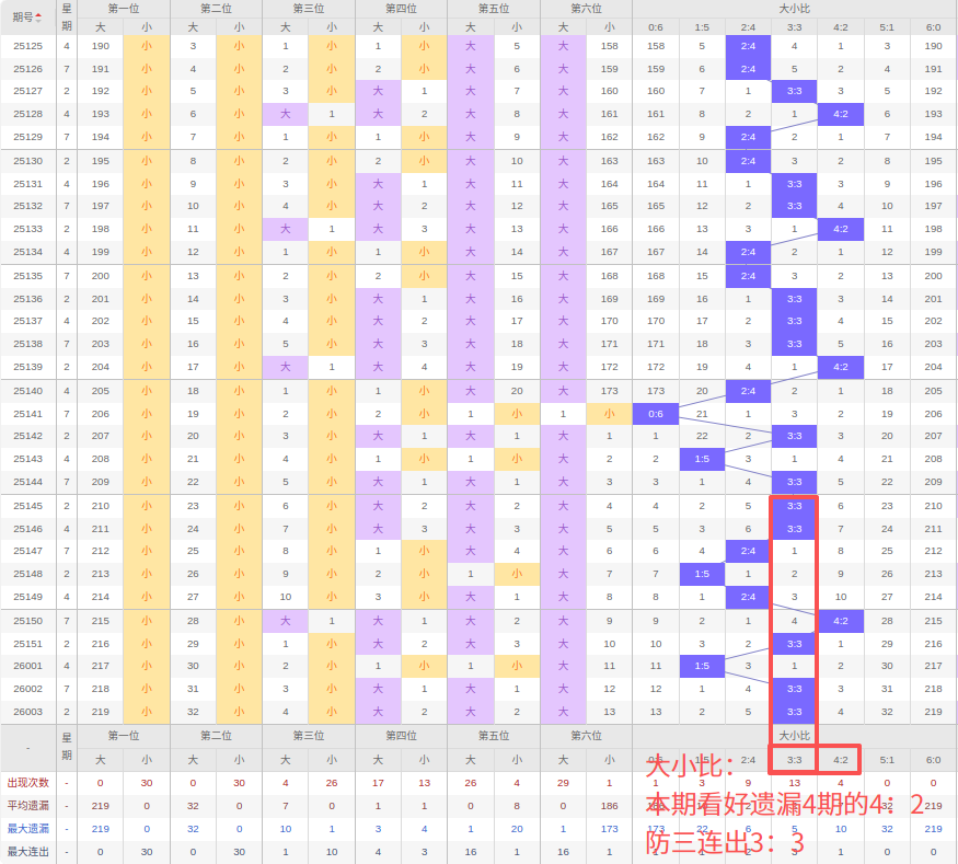 上期大小比:3:3,近10期大小比出现情况:3:3、3:3、2:4、1:5、2:4、4:2、3:3、1:5、3:3、3:3,最近10期出现5期3:3,出现1期4:2,出2期2:4,出现0期5:1,出现2期1:5,出现0期6:0,出现0期0:6,根据近10期规律本期看好遗漏4期的4:2,防三连出3:3,综上所述推荐大小比推荐:3:3,重点关注:4:2。