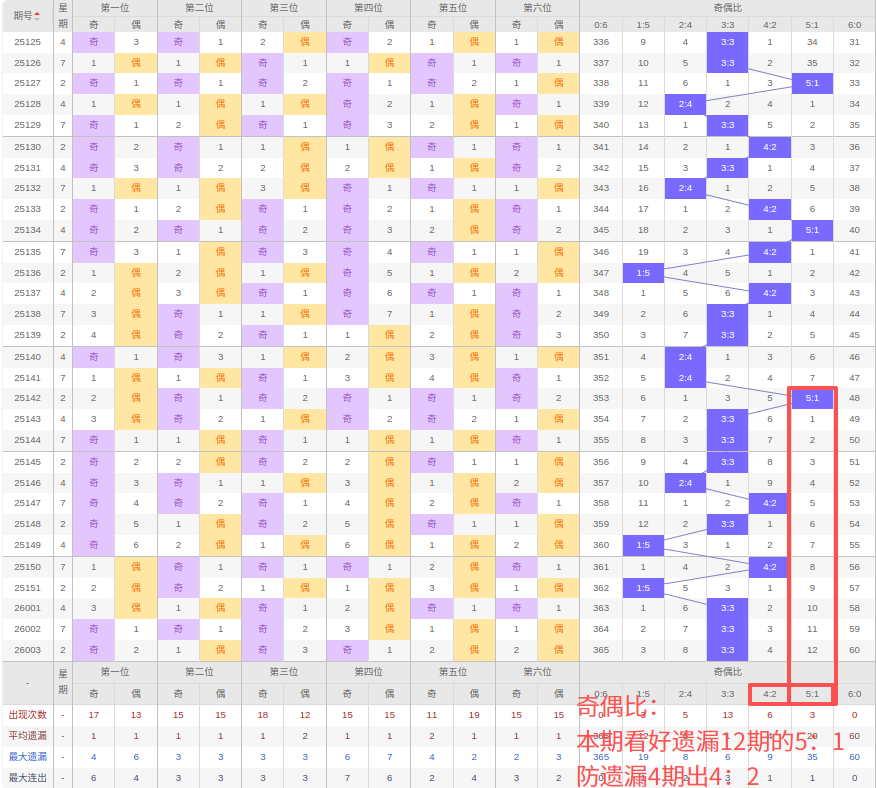 上期奇偶比:3:3,近10期奇偶比出现情况:3:3、2:4、4:2、3:3、1:5、4:2、1:5、3:3、3:3、3:3,最近10期出现5期3:3,出现2期4:2,出现1期2:4,出现0期5:1,出现2期1:5,出现0期6:0,出现0期0:6,根据近10期规律本期看好遗漏12期出5:1,防遗漏4期出4:2,综上所述推荐奇偶比推荐:4:2,重点关注:5:1。