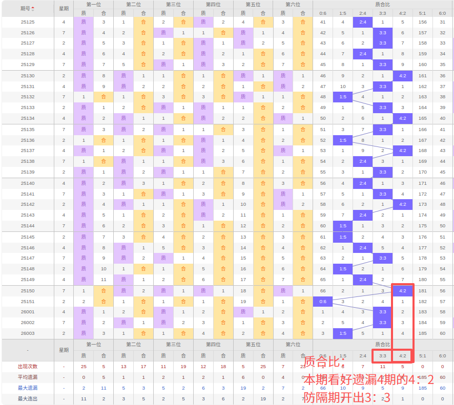 上期质合比:1:5,近10期质合比出现情况:1:5、2:4、3:3、1:5、2:4、4:2、0:6、3:3、3:3、1:5、,最近10期出3期3:3,出现1期4:2,出现1期2:4,出现0期5:1,出现3期1:5,出现0期6:0,出现1期0:6,根据近10期规律本期看好遗漏4期出4:2,防隔期开出13:3,综上所述推荐质合比推荐:3:3,重点关注:4:2。