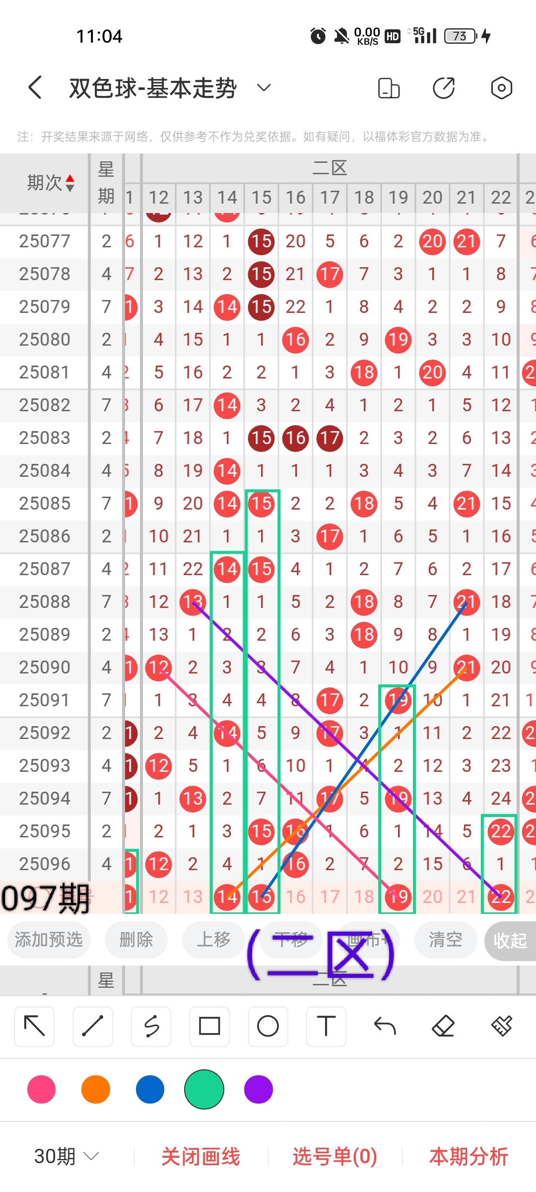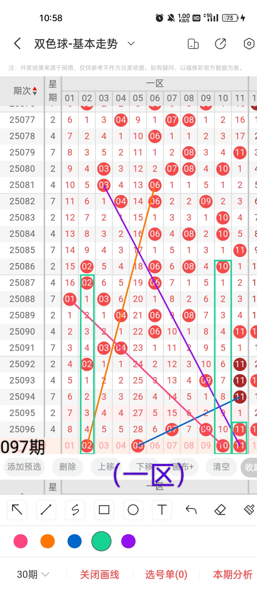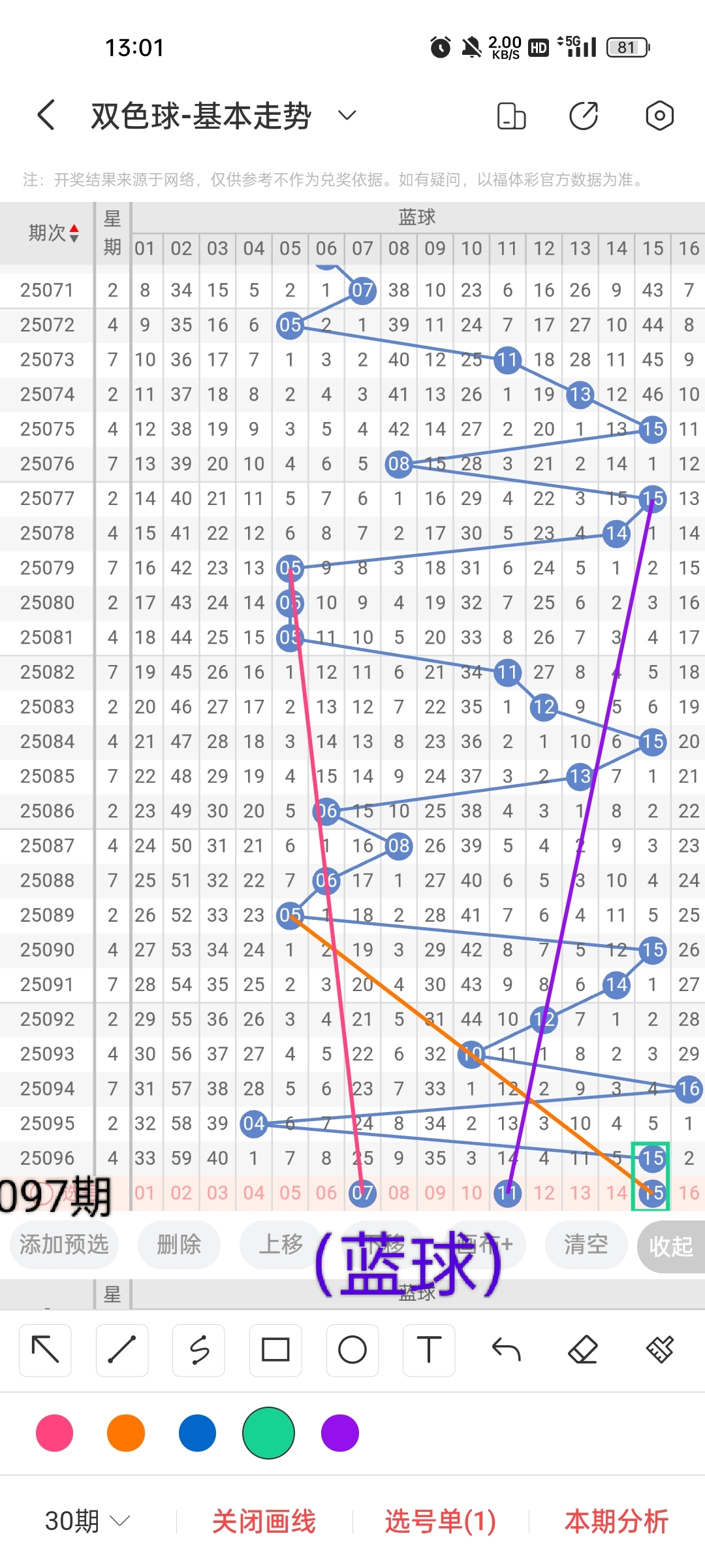 小梁根据图中画线思路,最后给大家汇总提供一下本期红球、蓝球数据,供大家参考: