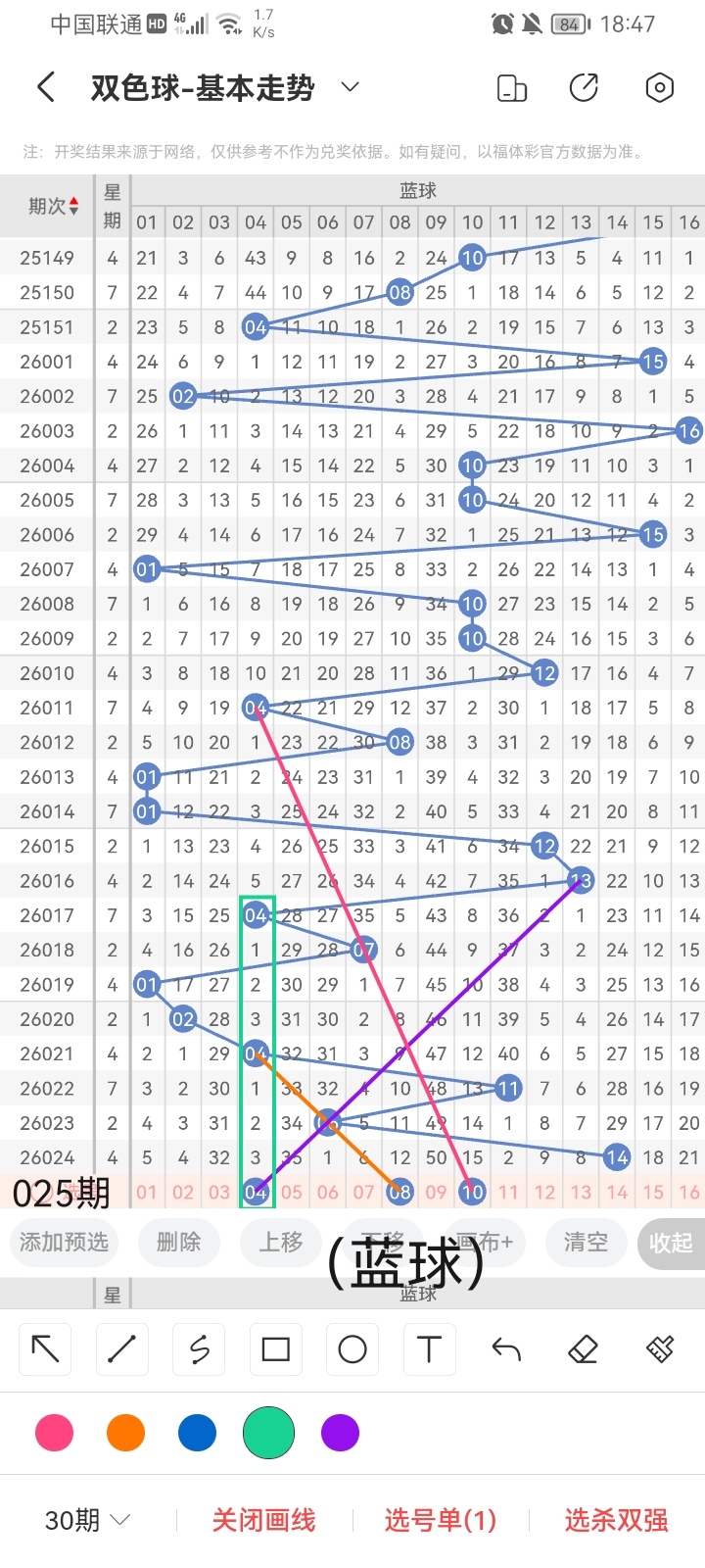 小梁结合上面图中画线思路分析得出,最后给大家汇总提供一下本期红球、蓝球数据,供大家参考: