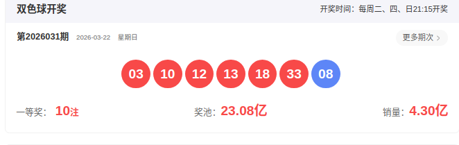 开奖号码:03 10 12 13 18 33-08