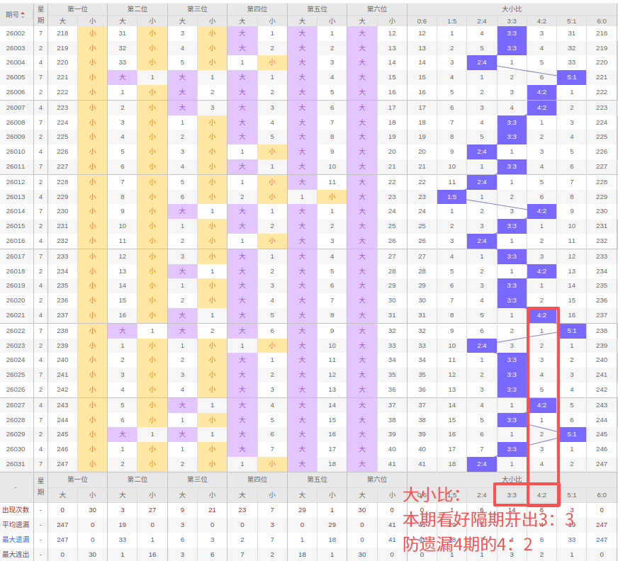 上期大小比:2:4,近10期大小比出现情况:5:1、2:4、3:3、3:3、3:3、4:2、3:3、5:1、3:3、2:4,最近10期出现5期3:3,出现1期4:2,出2期2:4,出现2期5:1,出现0期1:5,出现0期6:0,出现0期0:6,根据近10期规律本期看好隔期开出3:3,防遗漏4期出4:2,综上所述推荐大小比推荐:4:2,重点关注:3:3。