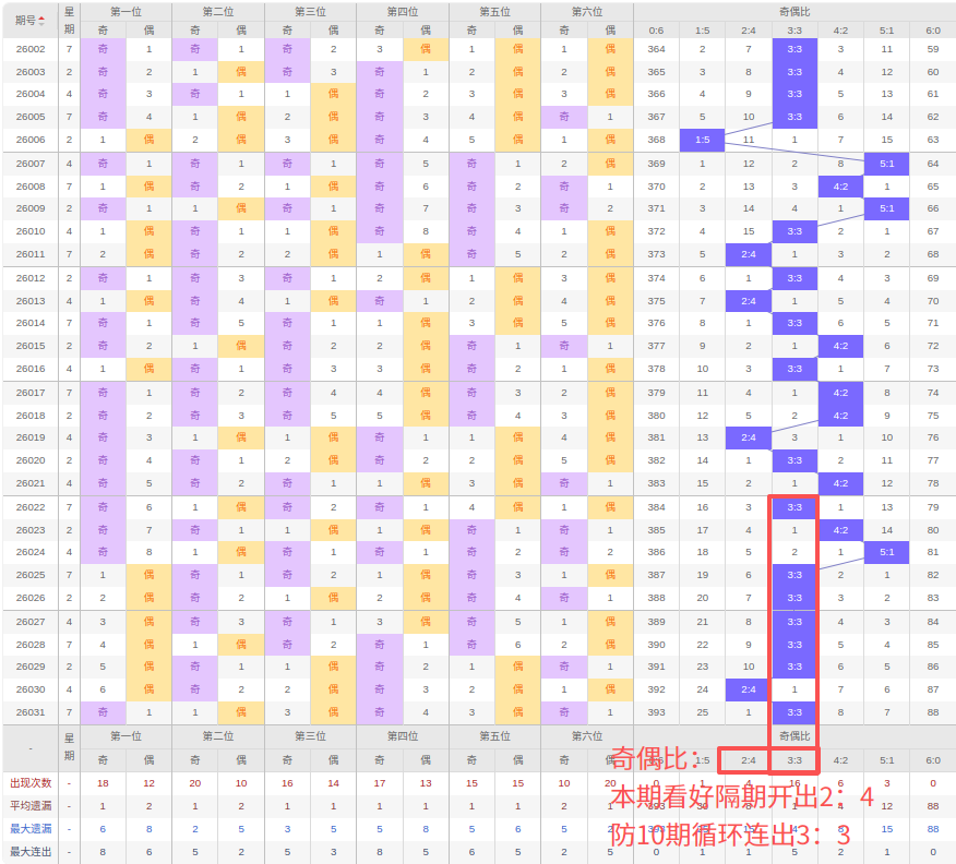 上期奇偶比:3:3,近10期奇偶比出现情况:3:3、4:2、5:1、3:3、3:3、3:3、3:3、3:3、2:4、3:3,最近10期出现7期3:3,出现1期4:2,出现1期2:4,出现1期5:1,出现0期1:5,出现0期6:0,出现0期0:6,根据近10期规律本期看好隔期的2:4,防10期循环的3:3,综上所述推荐奇偶比推荐:3:3,重点关注:2:4。
