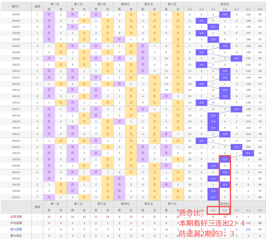 上期质合比:2:4,近10期质合比出现情况:1:5、4:2、5:1、3:3、2:4、3:3、2:4、3:3、2:4、2:4,最近10期出3期3:3,出现1期4:2,出现4期2:4,出现1期5:1,出现1期1:5,出现0期6:0,出现0期0:6,根据近10期规律本期看好三连出的2:4,防遗漏2期的3:3,综上所述推荐质合比推荐:3:3,重点关注:2:4。