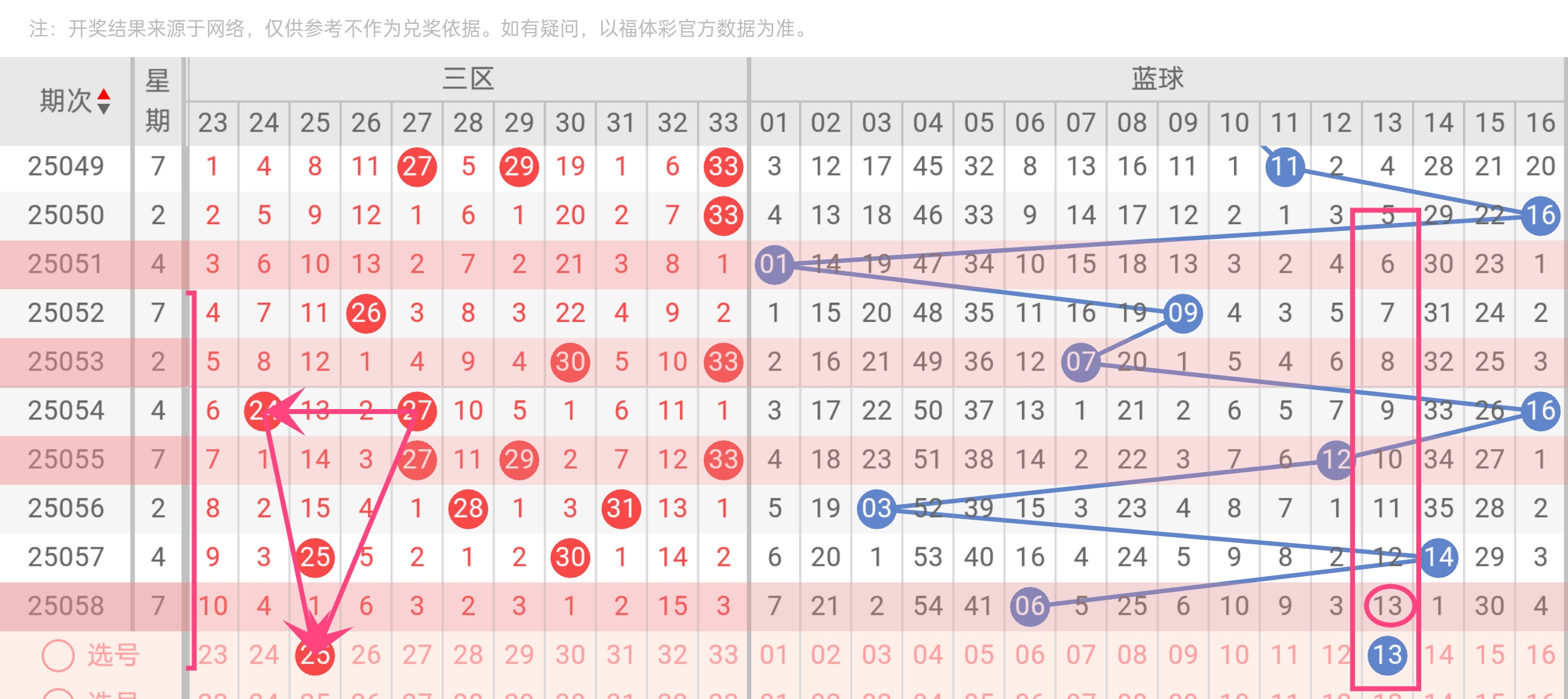 -红球25:近20期仅出现3次,遗漏6期,大号区(23-33)需平衡分布,25在近50期出现频率稳定(8次),避免过度集中。