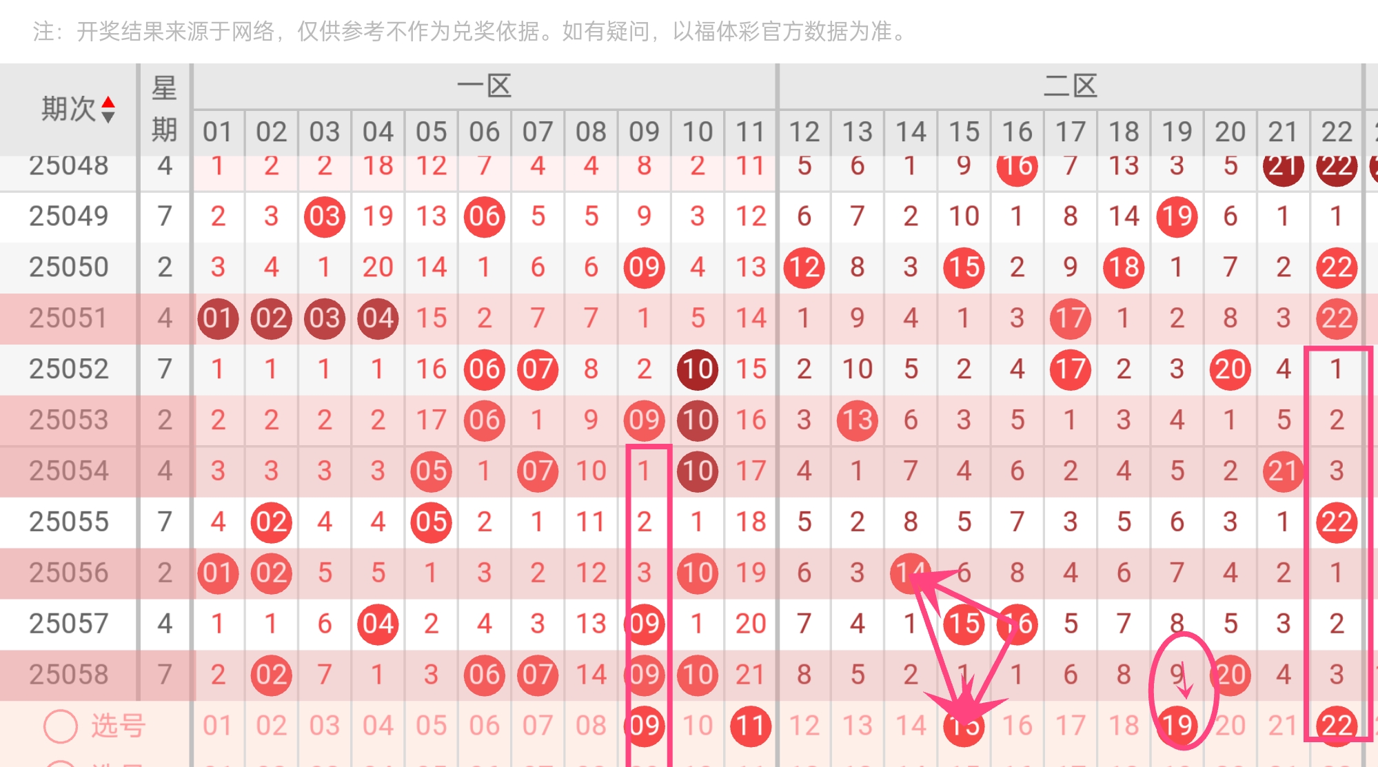 -红球19:遗漏8期,历史回补周期为8-10期,当前处于临界值,中后区(15-25)近期活跃,可赌其复出。