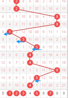 上图是体彩七星彩从左到右定位中的第六位走势图,我在上面标注出来的数字都是质数12357,你们看上面走势图中标注出来的蓝色小箭头就知道,最近这位数字开出的合数多,开出的质数少,而且最近连续5期开出的号码都是合数,那么本期个人关注就是关注这位数字出质数12357。