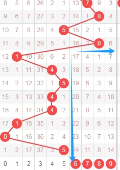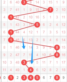 上图是体彩七星彩从左到右定位中的第三位走势图,我在上面标注出来的数字13458,是我看好的数字范围,因为你们看上面走势图中标注出来的蓝色箭头就知道,最近连续两期开奖号码中出现的遗漏周期大,上期开出数字4遗漏周期是16期,上上期开出的数字是3遗漏周期是7期,所以本期这位数字关注出遗漏周期小的是最13458。
