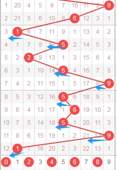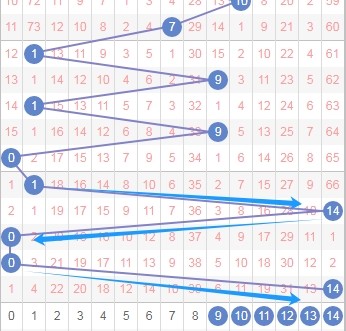 上图是体彩七星彩从左到右定位中的第七位走势图,我在上面标注出来的数字09 10 11 12 13 14,因为你们看上面走势图中标注出来的蓝色大箭头就知道,最近四期开奖号码中出现了3次大跨度,那么本期这第七位数字应该关注出小跨度的数字,于是就关注数字09 10 11 12 13 14。