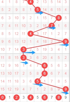 上图是体彩七星彩从左到右定位中的第二位走势图,我在上面标注出来的数字是6789,看上面走势图中标注出来的蓝色大箭头会发现,最近这位数字开出的号码都在蓝色大箭头的左边,蓝色大箭头的右边连续8期没出现过号码,本期个人观点看好出蓝色大箭头的右边数字6789。