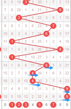 上图是体彩七星彩从左到右定位中的第四位走势图,我在上面标注出来的数字都是偶数02468,你们看上面走势图中标注出来的蓝色小箭头就知道,最近这位数字开出的奇数多,开出的偶数少,那么本期个人关注就是关注这位数字出偶数02468。
