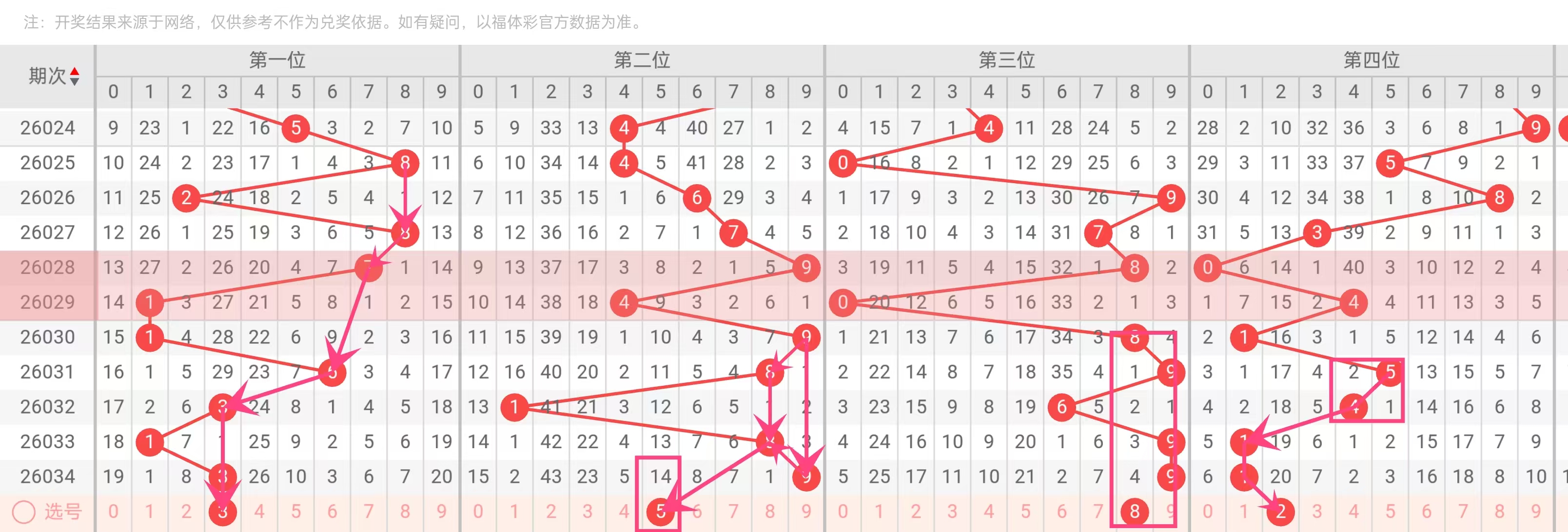 从走势来看,近期大号区域(尤其是5-7区间)开出较为密集,但高位(8、9)略显沉寂。选号时通过纳入“8”作为冷号回补,同时保留“5”和“7”作为热号跟进,既顺应了热号持续的趋势,又埋伏了冷号反弹的预期。这种“热冷结合”的手法,是资深彩民构建号码时最常见的避坑策略——既不完全追热,也不盲目守冷。