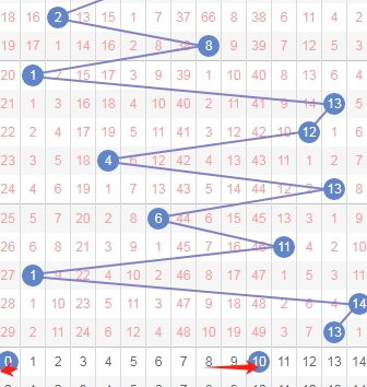 上图是体彩七星彩蓝球开奖号码走势分布图,我标注出来的数字是蓝球0尾数数字0 10,到本期为止蓝球0尾数数字已经连续遗漏了29期,那么本期或者近期大家还是要记得留意一下蓝球0尾数的数字。