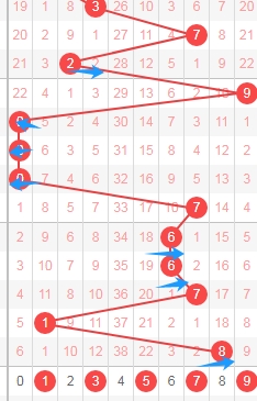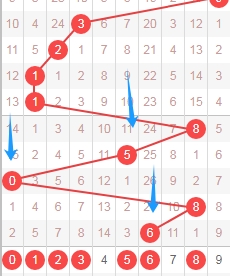 上图是体彩七星彩从左到右定位第六位数字,我标注出来的蓝色箭头表示奇数数字,很明显最近7期开出了6期奇数数字,那么本期可以关注出偶数数字02468,个人最看好数字0246。