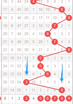 上图是体彩七星彩从左到右定位第二位数字,我标注出来的蓝色箭头表示遗漏周期,上期开出数字9遗漏周期是9期,上上期开出数字3遗漏周期是33期,那么本期可以关注出遗漏周期小的数字356789,个人最看好数字56789。