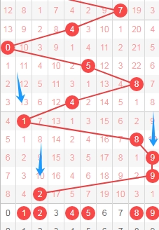上图是体彩七星彩从左到右定位第三位数字,我标注出来的蓝色箭头表示质数数字,很明显最近7期开出了6期质数数字,那么本期可以关注出合数数字04689,个人最看好数字4689。