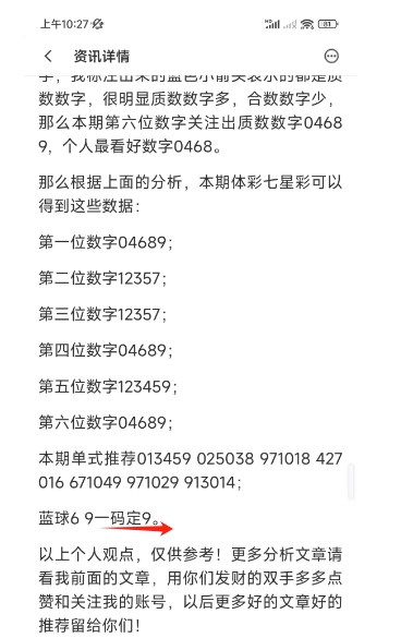 上图是上期体彩七星彩号码分析文章截图,我最后推荐的蓝球一码定蓝球9开8,这个你们去看上期的文章吧。