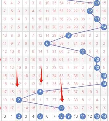 上图是体彩七星彩蓝球开奖号码走势分布图,我标注出来的红色小箭头表示遗漏周期,上期开出数字8遗漏周期是66期,最近3期蓝球开出的遗漏周期都有点大,那么本期关注出遗漏周期小的数字2 5 8 9 11 13 14。