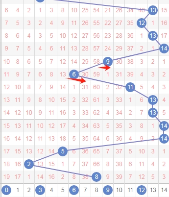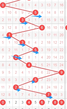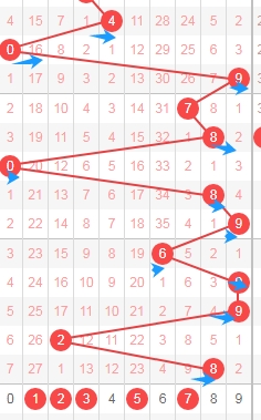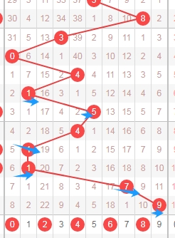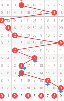 上图是体彩七星彩蓝球开奖号码走势分布图,我标注出来的红色小箭头表示0路球蓝球已经连续遗漏了8期,0路球蓝球数字有0 3 6 9 12,那么本期或者近期可以留意这些0路球蓝球数字。
