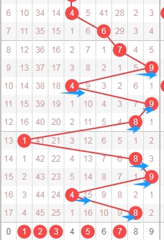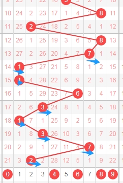 上图是体彩七星彩从左到右定位第一位走势图,我标注出来的数字都是合数数字,标注出来的蓝色小箭头都是质数数字,很明显最近开出的质数数字有点多,那么本期第一位数字可以关注出合数数字04689,个人最看好数字0468。