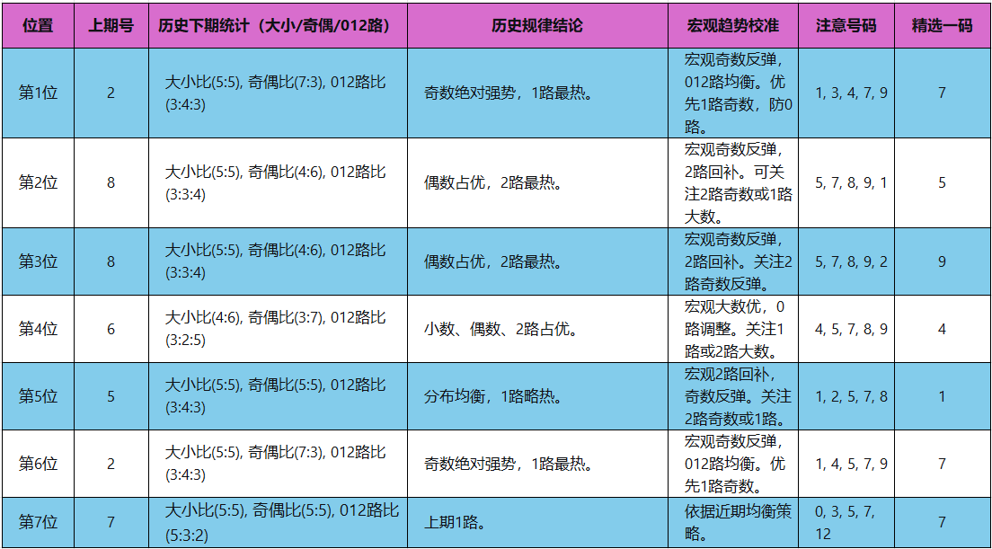 • 本期策略:在近期均衡的格局下,不预设主导路数。重点关注温热号的延续(如5,7)及冷号(如0,3,9)的反弹。上期开出1路7