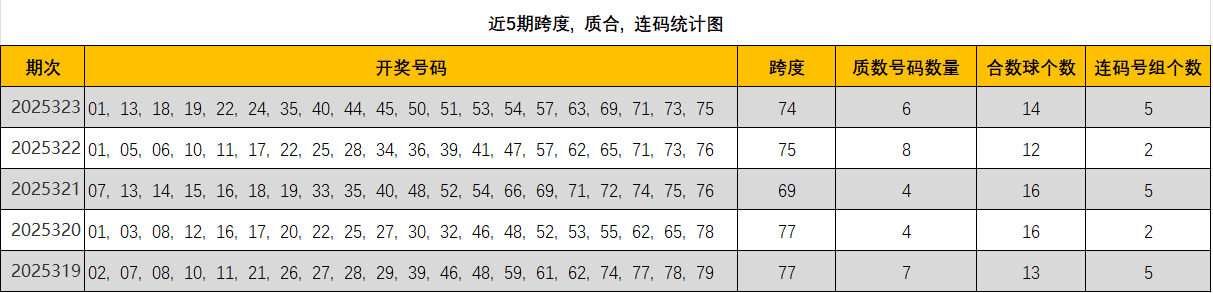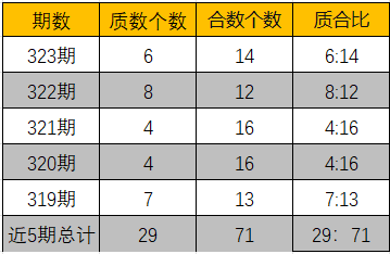 本期观点:合数在过去五期占据绝对主导(71个),但上期(322期)质数已显著回补至8个。预计本期质数热度可能延续,合数仍为主导但优势可能缩小。
