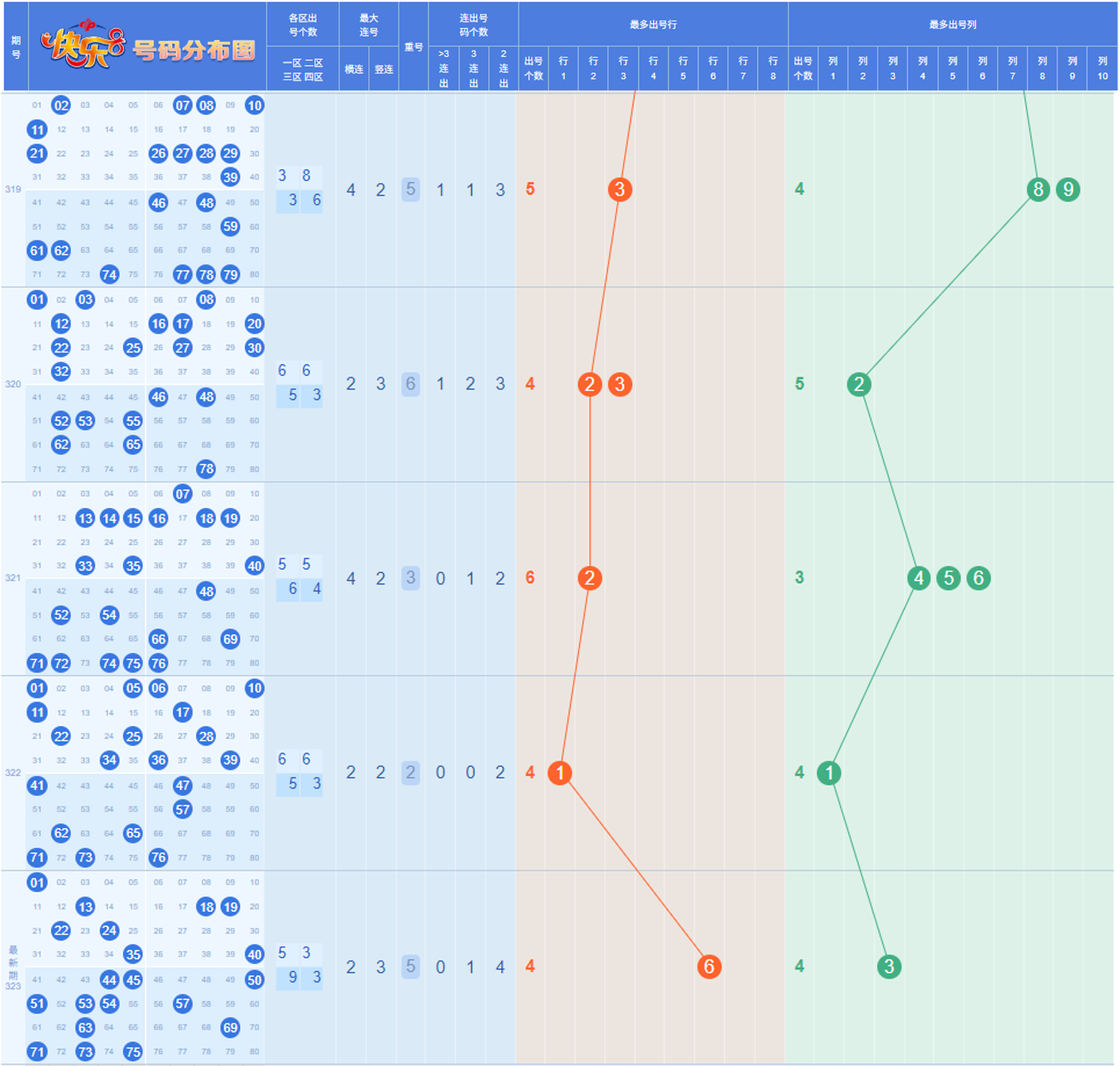 近期走势:连码持续高热且形态多样。近5期(323期至319期)每期均开出连码,其中323期开出4组(含一组三连码44-45),322期开出2组。三连码形态在近期(如321期)也时有出现。