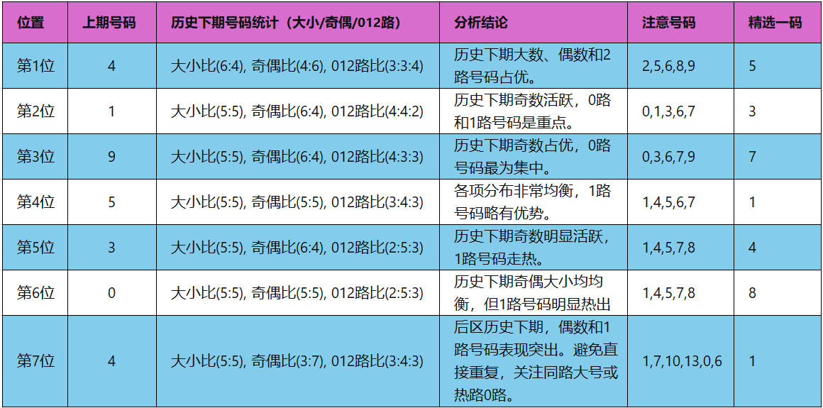 此分析针对第25141期奖号 4、1、9、5、3、0 + 4,查找历史上该位置开出相同号码后,其下期奖号的规律。